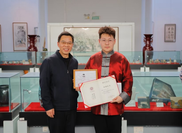 在開幕式上,北方工業大學正式收藏王元作品《青春多招展,成熟更自謙》,并由校紀委書記段輝建頒發收藏證書。