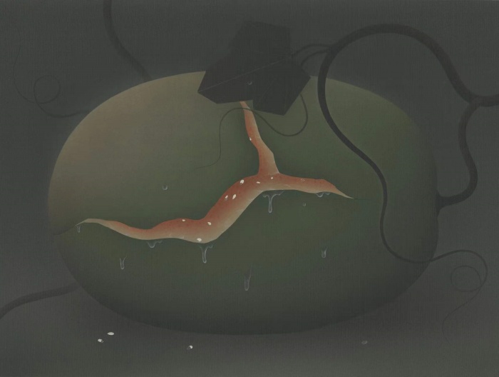 隨著時代的變遷,靜物的含義和表達方式正在不斷延展。曾志欽的作品多籠罩在黑色背景中,幾何化的造型頗具形而上氣質,裂開的瓜預示著過度成熟、碰撞、迭代、緊張。李易紋用冷峻的眼光描繪日常一瞥捕捉到的事物,它們看似微不足道,卻總是在庸碌的生活中激起漣漪。