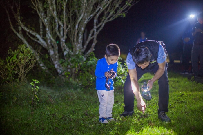 當這場流動的課堂向北延伸42公里,在暮色漸沉的普洱太陽河森林公園里,一群手提柔燈的小小探秘者正跟著森林體驗師的腳步,在蕨類植物垂落的綠簾間穿行。月光透過樹冠灑下斑駁的光影,照亮了絞殺榕的生存智慧,也叫醒了夜色中的點點螢火。他們的行囊里裝著剛采集的刺栲果實,衣襟上沾著不知名的野花瓣,認真地尋覓昆蟲的蹤影,而林間的風正悄悄記錄著這場與自然的對話——當城市霓虹亮起時,這里的生命正以另一種方式蘇醒。
