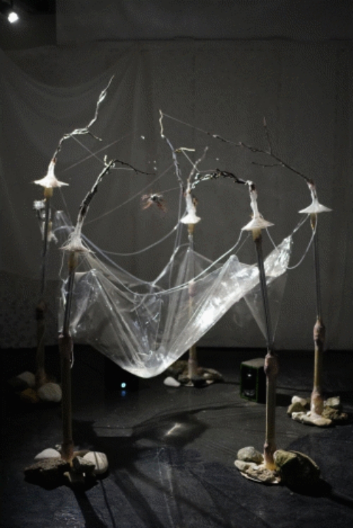 《嫁接》的空間是流動的,也是敞開的。作品邀請觀眾用觸覺喚起聽覺,激活一個個被壓抑或漂泊的記憶碎片。在技術層面,傅瑞琳使用ESP32微控板與MaxMsp環境實現了聲音的生成與響應,使得裝置不只是“被觀看”的客體,而是一個互動式共振體——情感被織入空間,觀者則成為“參與性嫁接”的共同體一部分。她并未為“移民經驗”下定義,而是構造出一個持續生成、不斷“愈合”的記憶場域,向觀眾提出一個溫柔但深刻的問題:你是否也曾是一段被剪斷的枝條?
