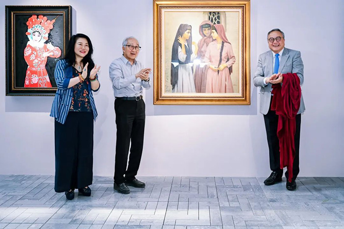 最后,靳尚誼先生、丁國榮局長和馬菁汝教授共同為靳尚誼先生的經典作品《三個塔吉克少女》揭幕。這件作品自藏家2006年在日本拍下以來首次公開亮相,這為廣大藝術愛好者、收藏家以及行業專業人士提供了近距離欣賞這一藝術珍品的難得契機,也將開幕式推上了高潮。