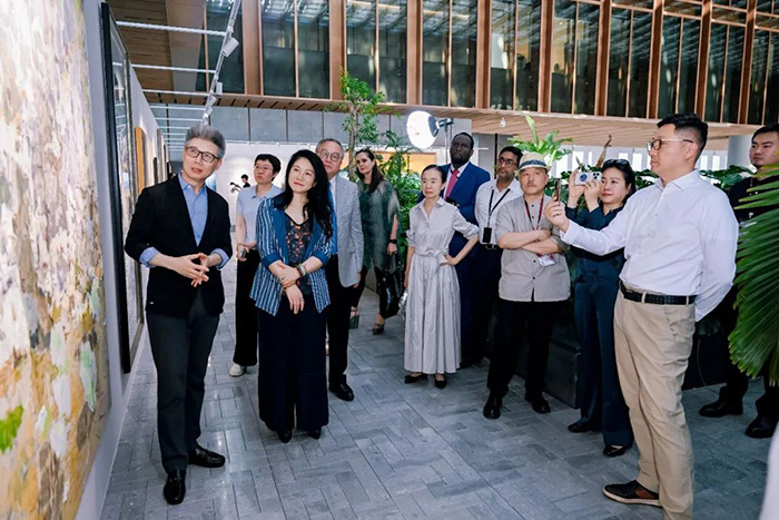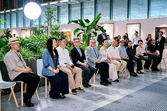 開幕式結束后,現場嘉賓與觀眾一起進入觀展、分享交流環節。學術主持尚輝教授與策展人馬菁汝教授沿著展覽脈絡,生動形象地為嘉賓們講解一幅幅精品佳作,獻上了一堂精彩紛呈的藝術美育課。來自不同領域的嘉賓們徜徉于清新的綠意中,在觀展中欣賞藝術、品鑒藝術、分享藝術,用藝術為炎炎夏日帶來清涼與芬芳。而本次展覽更精彩的篇章即將展開——它將作為重要文化窗口,迎接亞投行110個成員國的各國領導人蒞臨參觀。(圖片由主辦方提供)