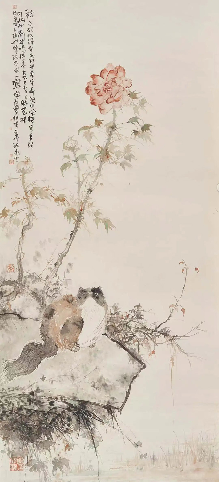 《牡丹貍奴圖》 劉萬鳴 紙本指墨 178.5×81cm
