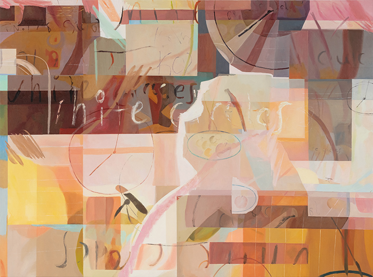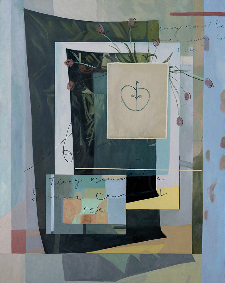 朱紫薇作品的強文本性也體現在畫面的涂鴉線條中。這些可辨認的詞句或不可辨認的線條,在保留敘事痕跡的同時亦提示著意義與解讀的邊界。另一方面,這些“書寫”作為一種身體運動的軌跡,或急迫或游移,其本身就是一種表達的姿態。又如朱紫薇作品中不時出現的被剖開的水果,也可視為藝術家的自我暴露,以及她對將繪畫形象平面化的長期興趣。