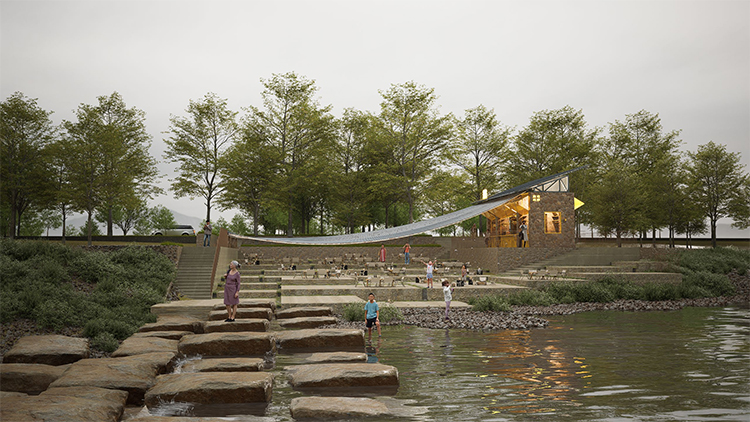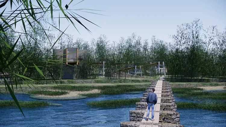 設計最大程度退讓已有江堤和原生林木,以裝配式鋼木結構為骨架,搭配毛石,片巖瓦等當地材料,與場所環境的先來者“共營”、“共建”、“共生“,再現東坡先生筆下的柳蔭堤岸閑行處。