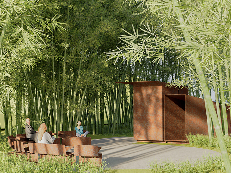 古橋微館是建筑師羅宇杰攜手藝術家劉慶元打造的“東坡樂事”主題藝術場景。建筑師在調研中發現, “鵝胸”與“板凳”是惠州鄉土古橋的兩種基本建造形制。于是,在十三壩古橋邊的竹林間,微館與棧橋自然嵌生其中, “鵝胸”壩的形態作為“古橋微館”,館藏藝術家十數幅對鄉下古橋的悉心摹畫, “板凳”則作為行進至展館的悠長路徑棧橋,整個游覽體驗借竹林間的縫隙生成來訪者的停留空間,人們在竹林間、棧道上、木臺上,倚靠、坐臥、靜思,遙望古人匠意的古橋營造,傾聽溪水清澗的潺潺流水。