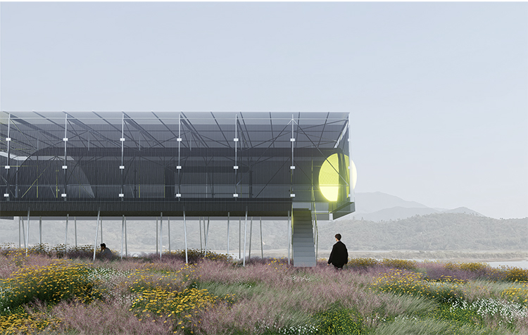 底層架空讓島即是花園變得完整,由隨機排列的細鋼柱支撐的建筑以輕盈的姿態懸浮于花園之上,混凝土如同抽象的船底,上部輕質的鋼結構保留的原花房拱形構架,庇護空間里的人,空間的核心是“雙月”并置:立面南北兩側各有一輪可轉動的明月裝置,分別朝向村落與水庫隨機轉動,與現實中的月象呼應。當訪客沿樓梯步入原花房屋頂中,烏篷下的拱形框架將視線引向遠方——天幕中的真月、立面的幻月與水中的倒影在此交疊,舉杯追問“明月幾輪?”。