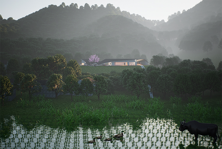 三個坡屋頂建筑體量通過灰空間(過渡空間)的屋面實現有機連接,自然融合成一道流暢的曲線屋頂景觀。屋頂下落到地面可供人們休息處一棵風鈴木穿過屋面,實現月下聞簫的畫面感。各灰空間的設計還充分考慮了觀景需求,讓身處其中的人們能夠遠眺峽谷農業生產景觀。