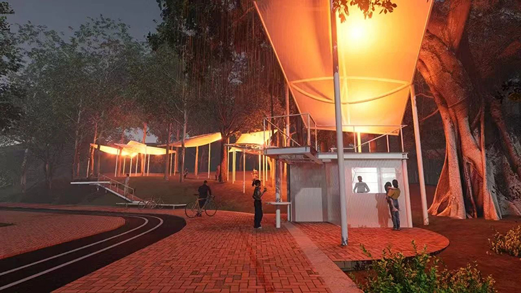風袂驛是眾建筑的建筑師臧峰攜手藝術家徐子薇、位昂打造的“東坡樂事”主題藝術場景。這里是輕揚、休閑、舒適與動感的一組公共空間,是“衣袂當風的驛站"。密林中的屋頂,如被隨手脫去飄揚的衣衫,被微風輕輕吹起的輕紗,在林間飛揚,舞動。材料選擇膜材與細鋼絲,形態輕柔多變,邀請人們放下生活中的繁重束縛,感受運動與自然帶來的寧靜與自由,以放松的狀態接待來客。