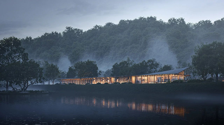 碧道長亭(長亭驛站)是由建筑師朱培棟打造的“東坡樂事”主題驛站。場地狹長,臨增江而立,背靠山下村莊,且原生樹木蔥蘢。建筑以“長亭”為意向,順應極其狹長的場地,沿江面一字展開,形成超尺度的江邊涼亭。連續的長亭屋頂之下設置了三處相互分離的為往來游客和騎行愛好者服務的功能盒子,盒子之間留出多處貫通環山碧道與江面之間的景觀通廊。