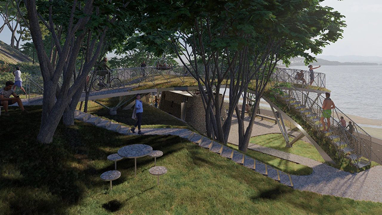 鳳谷驛是建筑師陸嘉鴻攜手藝術家 Chaosteria 打造的“東坡樂事”主題藝術場景。鳳谷驛藏身于水庫湖畔的山坡臺地間,如傳統道旁茶棚般輕盈棲居,五指狀的觀景挑臺從林間探向水面,將水庫風光盡收眼底。棚頂覆土與山林綠意相融,棚下提供咖啡休憩等便民設施,讓旅途更愜意。單車路徑蜿蜒穿梭,引導騎行者自由探索臺地與山林,感受運動與自然的和諧共鳴。這里不僅是休憩點,更是一處承載溫情、擁抱風景的所在。