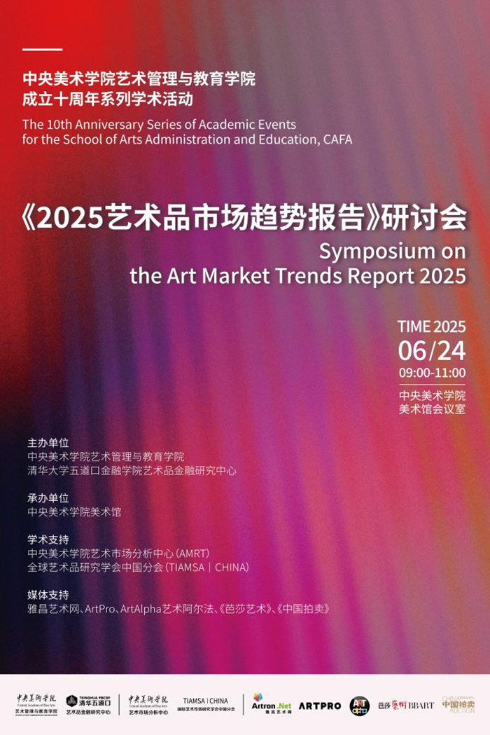 適逢中央美術學院藝術管理與教育學院成立十周年。作為十周年系列紀念活動之一,2025年6月24日,《2025藝術品市場趨勢報告》研討會在中央美術學院美術館順利舉辦。本次會議特邀十四位業界專家出席,由中央美術學院藝術管理與教育學院、清華大學五道口金融學院藝術品金融研究中心聯合主辦,中央美術學院美術館承辦,中央美術學院藝術市場分析中心(AMRT)、全球藝術品研究學會中國分會(TIAMSA|CHINA)提供學術支持。
