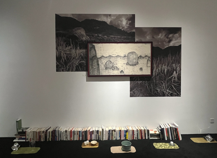 白云山下,時過境遷,穆陽鎮早已不是宋代時期的“繆洋”,黃方啟書齋式的工作室(展覽現場局部營造),遠離塵俗的水墨道場,隱于尋常的街頭巷尾,開門人間煙火,閉門深山古剎,以書為園林,構建內在時間場域,學術研究與繪畫創作均在其內,偶爾會友似古人,品茗清談抒懷。方寸之境,洞天福地,水墨推演,古往今來。倘若從短暫的個人史來看,黃方啟不斷面對與處理的是與自己、親人、家鄉的三重關系。自我的肉身與神思,血脈的根源與變異,家鄉的重塑與變遷。此三重關系使其時時警惕,警惕于自己是否葆有最初的純真童夢,最終見諸水墨。
