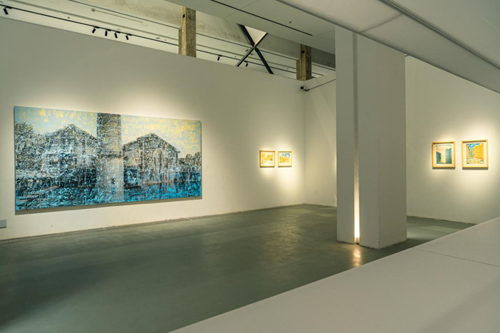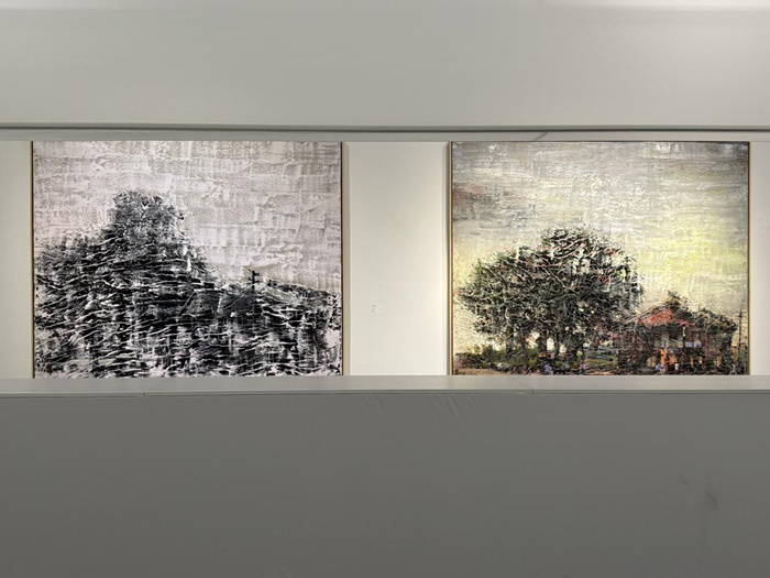在B1層展出的,皆為宿利群以陶溪川標志性建筑為主題創作的大尺幅新作:將放大的黑白影像作品附著在油畫布上后,使用各種顏料和手法進行覆蓋。與之對照展出的是,宿利群于2019年在陶溪川完成的一組小尺幅水墨作品。