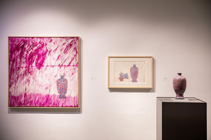 因2003年進入古瓷收藏,宿利群的繪畫作品中也開始越來越多地出現瓷器的身影。近十年來,宿利群以瓷器為題材,創作出了大量水墨、油畫作品。在這些作品中,他對殘缺的瓷片、精巧的紋飾,被覆蓋的器皿,賦予了個人情感的詮釋,并融入了關于文化的思考,使歷史的滄桑與厚重躍然于畫面之上。一樓展出的作品以組合的方式出現:一件被修補的器物,一幅以該器物為題材的水墨作品,以及另一幅同樣主題的油畫作品。水墨作品情感細膩、筆觸溫婉,油畫的畫面則被顏料層層覆蓋。