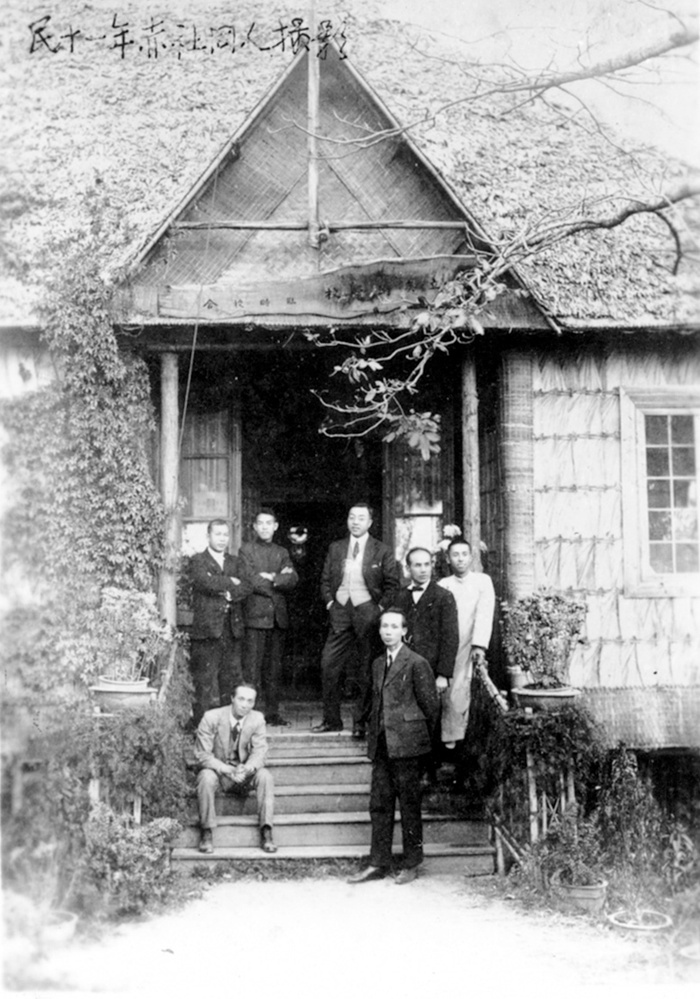 1922年,赤社第二次畫展在廣州中央公園東北邊蓋搭的葵棚舉辦。赤社同仁前排左起:梅雨天(與天)、胡根天;后排左起:梁鑾、盧子樞、陳丘山、馮鋼百、徐守義(東白)