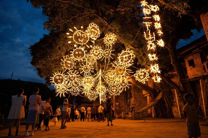 除門面美術館以外,藝術家張增增又和當地居民李小松進行了再一次合作,他們以村里常年見不到父母的孩子們為契機,將孩子們的思念轉化為簡筆畫太陽的燈光路徑,懸掛在樹上,并運用手搖的方式發電,將孩子們的思念具象化。將羊磴最活潑的一批“人氣兒”聚集起來,用光芒照亮思念。