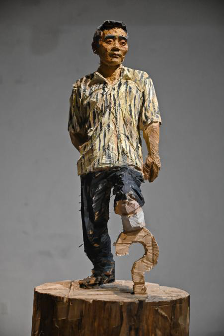 《木雕速寫——羊磴》用看似輕松的“筆觸”雕出最真實的羊磴人,這次看到鄧坤時,他正在雕羊磴的羊,渾身被木屑包裹,皮膚被曬得黝黑發亮,而眼神比從前清亮了些許。藝術家自述中提到:“我要求自己必須每天雕完一個人,不是因為趕進度,是因為時間的限制會激發出爆發力和果斷力,能有力體現在木雕作品上,即便有表達不太好或者失敗的,它也顯得真實?!彼x擇的雕刻角色也十分有羊磴感,除了胡館長、羊磴的羊之外,其中王靜的“問號腿”作為羊磴“土而奇”的經典一瞬也被納入其中。