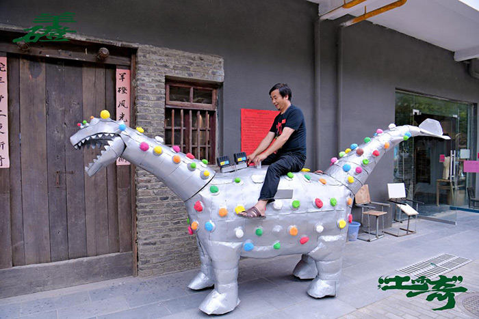 羊磴鄉村美術館現場 騎恐龍的胡館長(圖片由桐梓縣羊磴藝術協會提供)