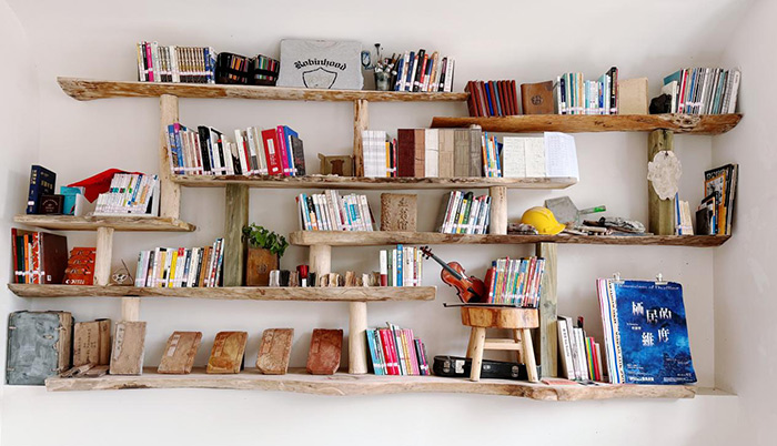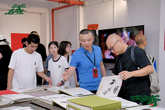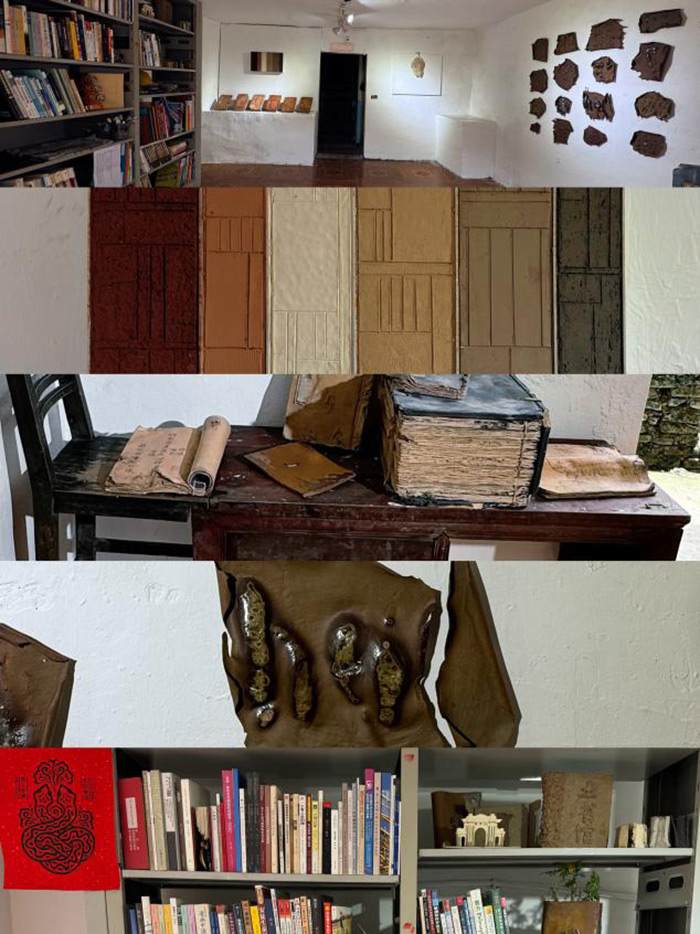 本次藝術鄉場除新科技以外,還以藝術的形式從羊磴之外帶來新鮮的地域文化?!锻習^——北京人與羊磴》意在探討地域文化交互,項目發起人王然以策展人杜曦云在2025年3月策劃的“羊磴在北京”展覽作為先決條件,實施反向交互推進,試圖進行一種文化回應。為了將新鮮的“地域特征”帶入羊磴,她邀請了一些北京藝術家用羊磴的土進行書籍相關的藝術創作及展出,其中運用了本地觀音土、護林員采的中草藥以及石材作為材料,強調羊磴水土與人文生態交互性。并招募北京各行各業人員進行書籍及其職業相關的小物件捐贈,將其統一作為裝置整體。使得新地域的能量注入、助力羊磴的實踐發展。