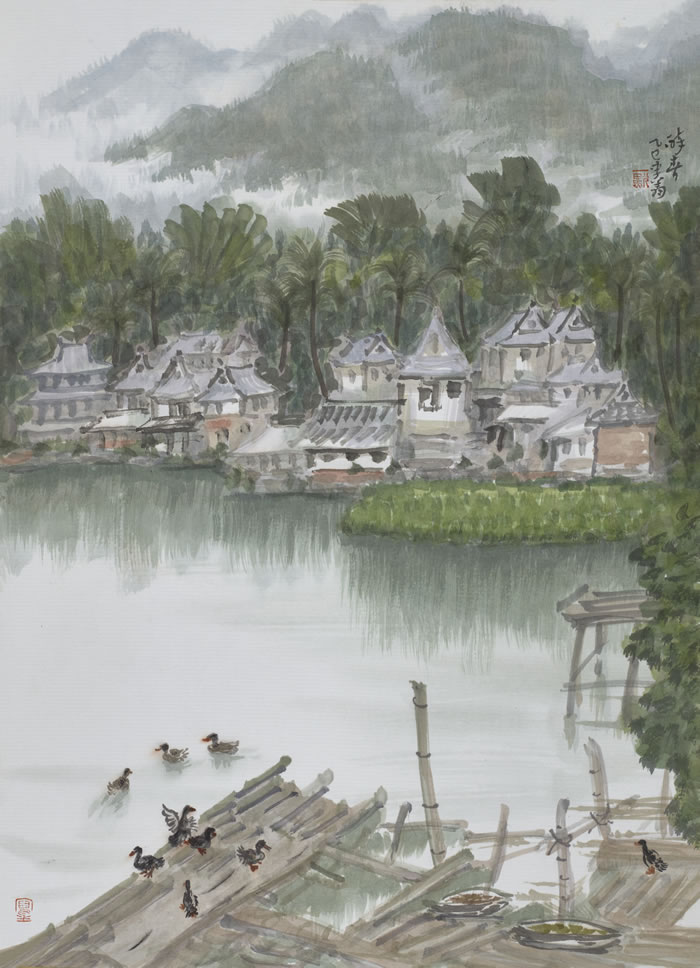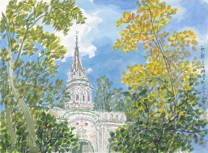 李翔《 新秋教堂古》宣紙設色 24cmX33cm 2015年