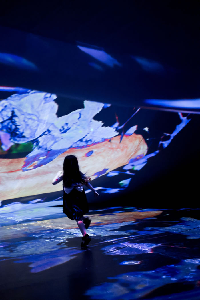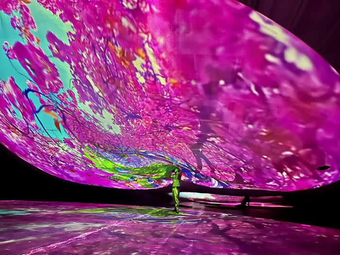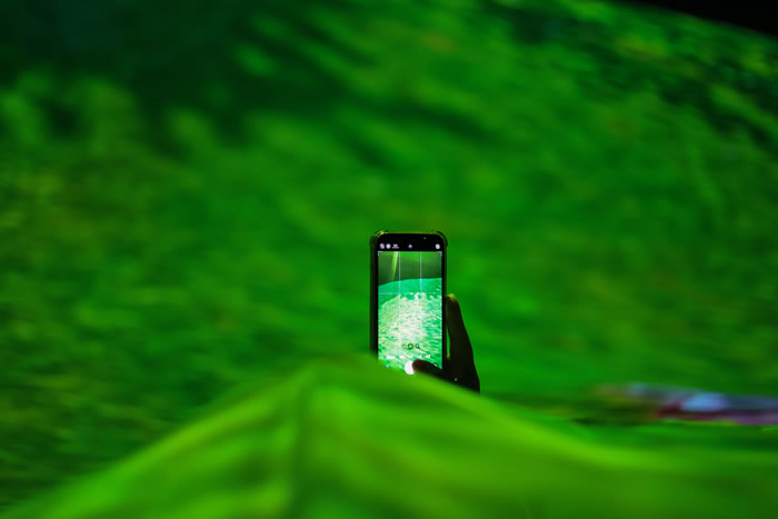 和作品融為一體,是《掌心宇宙》的魔力所在。步入其中,隨著耳畔音樂的流轉,眼前炫目的色彩變幻,人們不由得提起或推拉這層疊的幕布,參與到塑造自身與他者的體驗之中,從而凸顯了感知本質上的集體性與共享性。當觀眾沉浸于被“龐大身體”包裹的錯覺時,投影展現的田園式風景——田野、山巒、花園——時而經由鮮艷的色彩變幻而失真。這些景象既折射出人類與自然的聯結,又暗喻人類對環境的影響。特寫鏡頭將植物轉化為廣袤地形,彰顯生命體與環境間相互依存的關系。而屏幕上清晰可見的掌紋則令人聯想到地形圖,藝術家巧妙將微觀與宏觀連接,生動詮釋身體、空間與生態循環之間密不可分的共生關系。