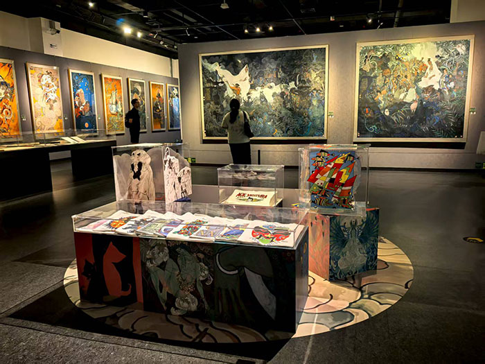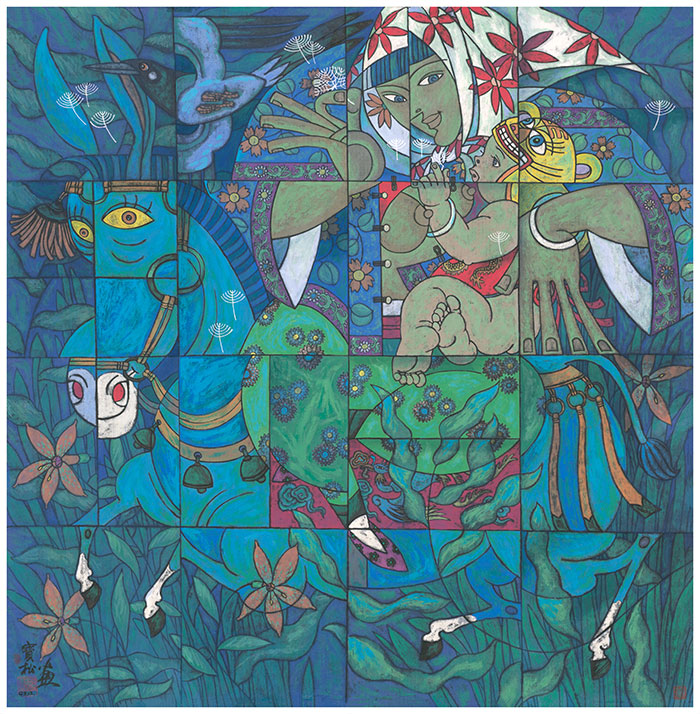 寶松長期活躍于中美藝術交流前沿,他的作品兼具西方抽象表現主義的視覺張力與東方工筆重彩的細膩精神,既借鑒了立體、波普等現代藝術流派的繪畫表達方式,又延續著傳統書畫的筆墨精神。通過神話主題、壁畫語言與傳統元素的當代轉化,他的創作不僅形成了獨特的視覺語言,更具有鮮明的文化自覺性,這種跨文化的藝術探索,也展現了他作為華僑藝術家在多元語境下的藝術創新能力。
