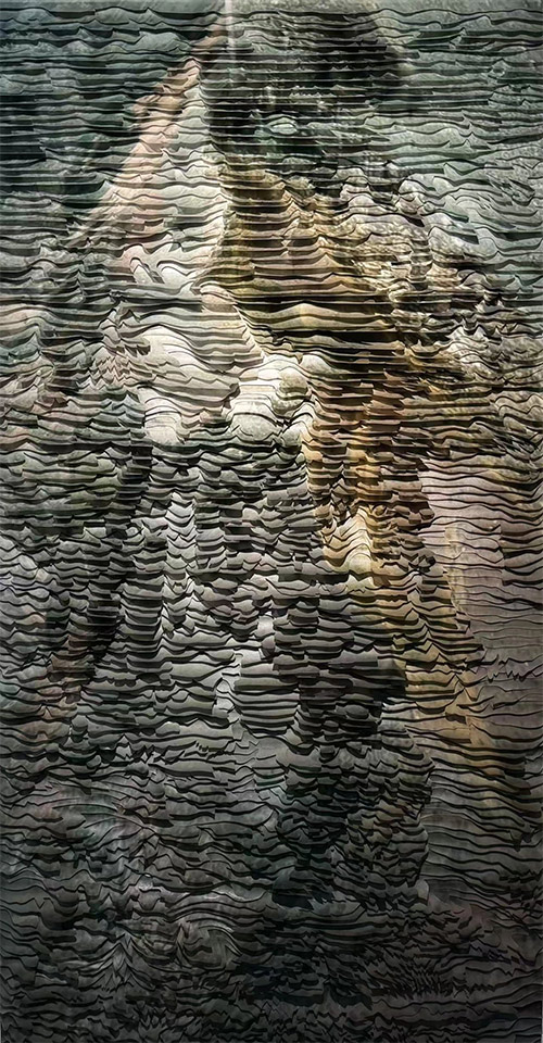 藝術家張曉棟是龍鱗裝書籍藝術非遺傳承人。他發展出的“千頁藝術”,用紙的疊壓就形成了景的隱顯,遠觀萬千氣象、古韻奇觀,近看鱗鱗相疊,如墜夢境。千頁藝術的核心魅力,在于它用物理的堆疊制造視覺的哲學。張曉棟以紙為刃、以疊為墨,創造出獨特的“二點五維空間”,這種視覺張力被夏可君老師稱為“萬物呼吸的共振”。紙頁的凹凸形成微型山谷,光線在其間折射、漫射,色彩隨角度變幻明暗,如同為傳統山水注入了“動態的皴法”。畫面不再是凝固的平面,而成為承載“時間褶皺”的載體。張曉棟找了一種新的創作媒介,看不到任何西方的影子,它深深的扎根于中國文化根脈,但又是在此基礎上形成的世界化的語言?!?/p>