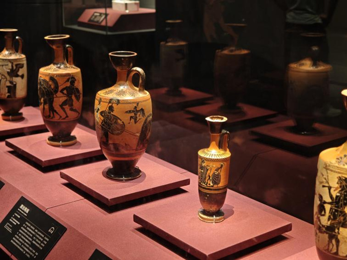 本展覽結合場景復原、建筑工程圖、雕塑、器物、文案等,充分展示古希臘文明。觀眾穿梭在展廳里,走過繪有帕特農神廟的女像柱的展墻,瀏覽一個個展柜,閱讀一面面文字,如同進入了醉人的古希臘世界,仿佛聽到了那遠古異邦傳來的聲音,與文明對話。