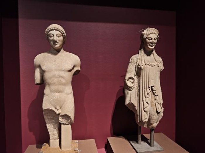 不少重量級代表性展品亮相本次展覽,比如之前提到的荷馬的頭像。還有就是亞歷山大大帝的頭像、阿伽門農黃金面具、希臘化時代的黃金花冠,以及古希臘悲喜戲劇的面具石雕,以及被稱為面部具有“古風式微笑”的男女形象雕塑——庫洛斯(男)、科萊(女)。這些展品在古希臘文化中占據重要的地位,是觀眾可以重點了解的。當這些展品被重點陳列時,展覽的輕重緩急便更加分明,有層次感。