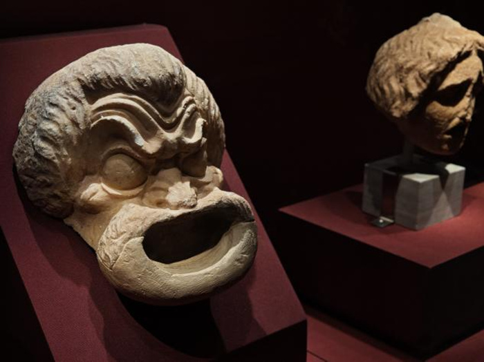古希臘戲劇的石雕面具(近處為喜劇面具,遠處為悲劇面具)