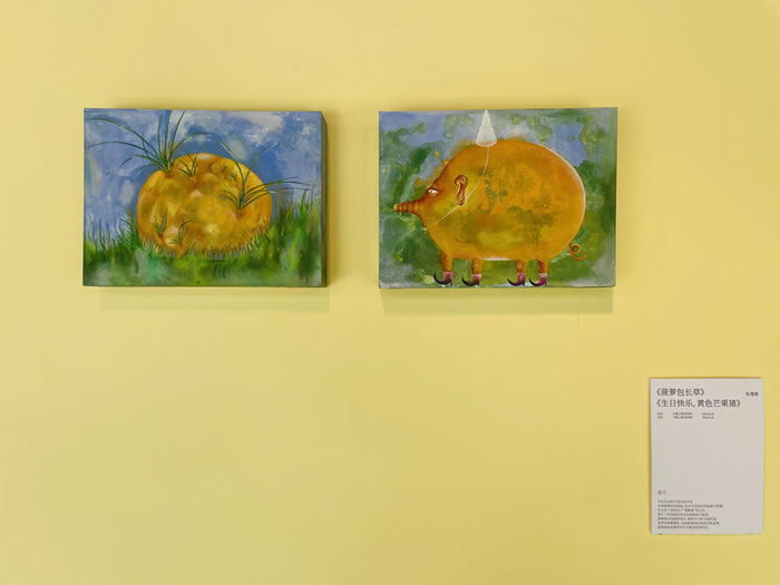 藝術實踐以“瞬間”為軸:劉江昊的黃銅 《時間印章》,把“現在/過去”壓縮成一次落??;于文用布面油畫,將水面波光與卵石倒影凍結為一幀童年水影;梓靖將逝去的樂園一頁頁裝訂成冊,輕輕喚起我們塵封的記憶與溫柔的共鳴。李佳卿把舊金屬焊成輕晃的《樂園》,讓童真色彩隨齒輪邊緣旋轉而上;張逸馳在木板上以高飽和色描繪“芒果豬”、“菠蘿包”,用味覺記憶點亮轉瞬暖光;張戈用云朵羊毛傳遞松弛哲學,教我們溫柔釋放、自然生長。
