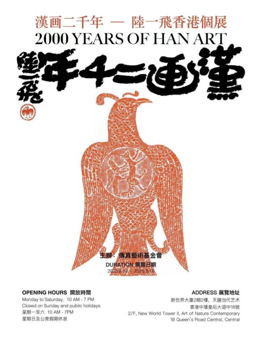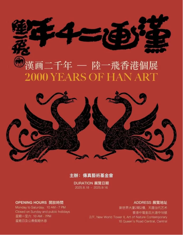 “漢畫二千年—陸一飛香港個展”于2025年8月18日至9月16日,在香港中環天趣當代藝術中心舉行。此次陸?飛的香港個展由傳真藝術基?會主辦,香港理工大學、商務印書館(香港)、鳳凰周刊、紫荊雜志等30家單位聯合支持,成為藝術家發起的《漢畫?千年》巡展的重要?站。