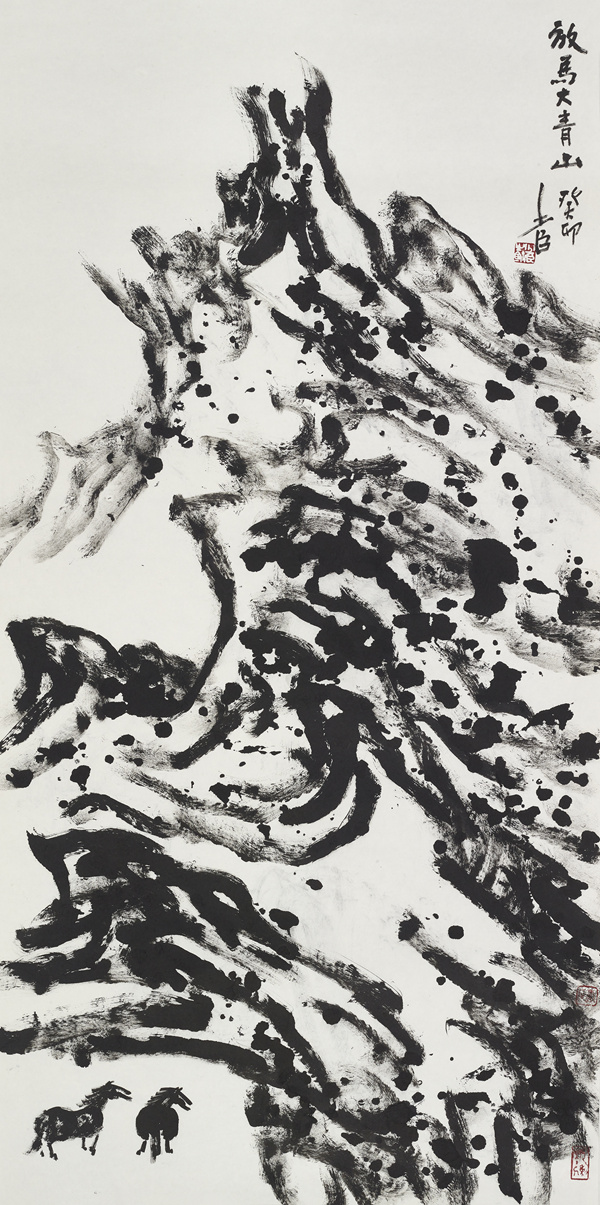 另外,邢少臣先生深諳“計白當黑”這一東方美學的精髓,并在創作中將其發揮得淋漓盡致。他精心經營畫面布局,使得空白與墨塊、線條相互生發,彼此映襯,共同構建出既空靈通透又渾厚飽滿的獨特審美空間。他對“虛”“實”關系的精妙掌控,使得畫面在雄強厚重之余不失靈動,充滿令人回味的哲思。