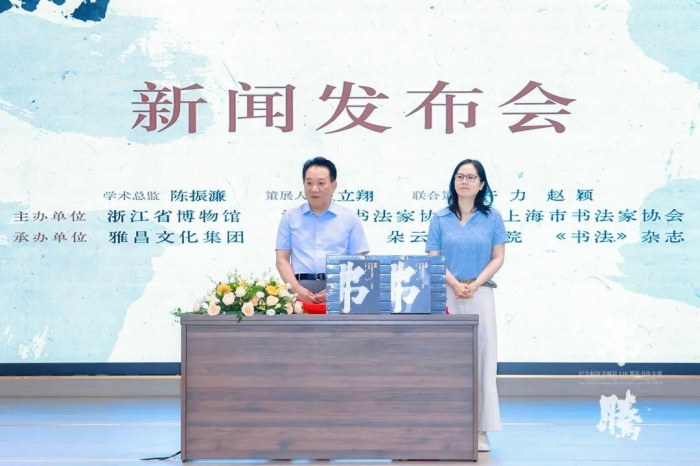 浙江省博物館黨委書記、館長紀云飛,中國書法家協會理事、書法評論與文化傳播委員會副主任、朵云軒書畫院院長、本次展覽策展人王立翔分別致辭。中國文學藝術界聯合會副主席、西泠印社副社長秘書長、本次展覽學術總監陳振濂宣布展覽開幕。新聞發布會由浙江省博物館副館長許洪流主持。