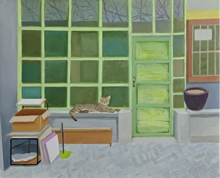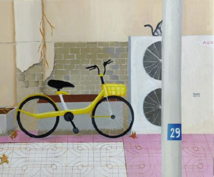 在《時光的褶皺》系列作品中,王蔚卿以西安市舊小區的樓道、街角,鄉村老屋、庭院與倉庫為描繪對象,捕捉那些被時光浸染的舊事物。斑駁的墻面、棄置的自行車以及散落在角落的舊物件,這些看似平凡的細節在光影交錯間呈現出靜謐的詩意,每一道裂痕都訴說著歲月的故事并記錄著生活的痕跡。藝術家運用厚涂技法強化墻面的滄桑感,以低飽和色調營造懷舊氛圍。通過平視或俯視的幾何構圖,將這些平凡角落升華為具有紀念碑意義的畫面。這不僅是對舊建筑與生活痕跡的藝術記錄,更是對城市化進程中逐漸消逝的記憶載體的凝視。藝術家希望通過畫筆留住它們的美學價值與精神重量,在快速變遷的時代中喚起人們對過往的溫柔回望與思考。