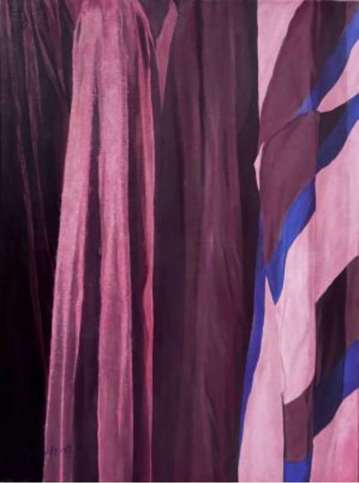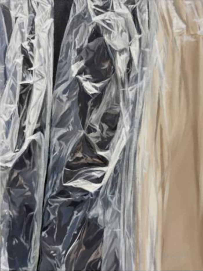 對俞意來說,衣櫥便是一個世界,縱使擠得滿滿,還是會為下一件留下空間。整齊各色的衣裳縫隙散出淡淡的樟腦味兒,衣架和衣架之間,懸掛著無數個“我”,時間在此凝固,喚起一個個瞬間的記憶,如同博物館中的標本,每一次打開它,便打開了昨天。而當玻璃紙沙沙作響、折射出微光,便意味著新的一天已然來臨——陽光灑落溫暖被褥,整裝,再出發。衣物舊了,一道道褶痕像是成長的年輪,既封存往事,也孕育新夢。藝術家用寫實的繪畫方式,不厭其煩地描繪衣裳中的每一條褶皺和圖案,這是對過去時光的回望。綿密疊加的筆觸下有每一天的溫度,創作過程會使人忘卻一切的煩惱,沉浸在自己的世界中。
