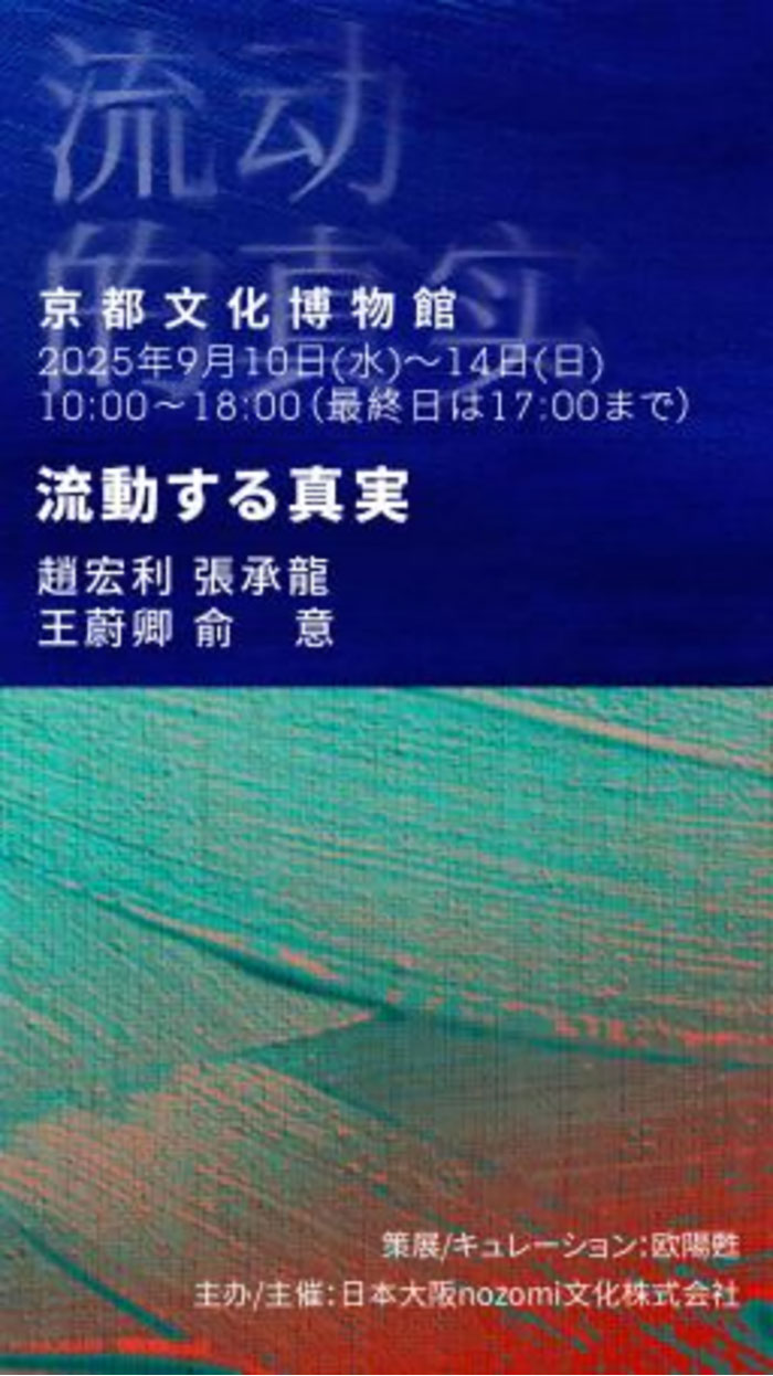 應日本京都文化博物館的邀請,由日本大阪nozomi文化株式會社主辦的“流動的真實”當代藝術展,于2025年9月10日至9月14日在該館舉辦。本次展覽集中呈現了四位來自中國上海、西安、杭州的優秀藝術家——趙宏利、張承龍、王蔚卿、俞意的多媒介創作,涵蓋油畫、瓷板畫、數字繪畫等多種藝術形式,以東方美學的當代表達,展開一場跨越文化與時空的對話。