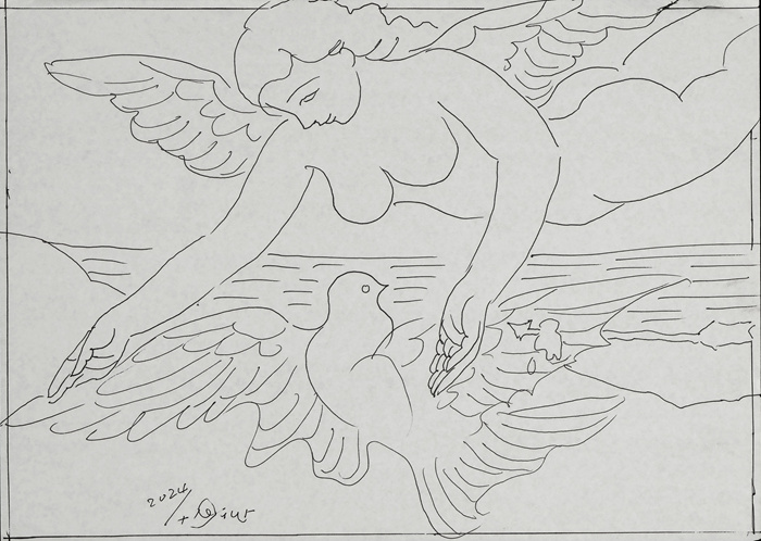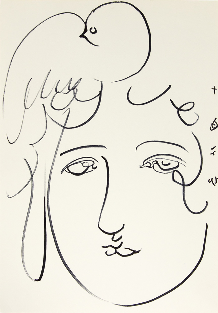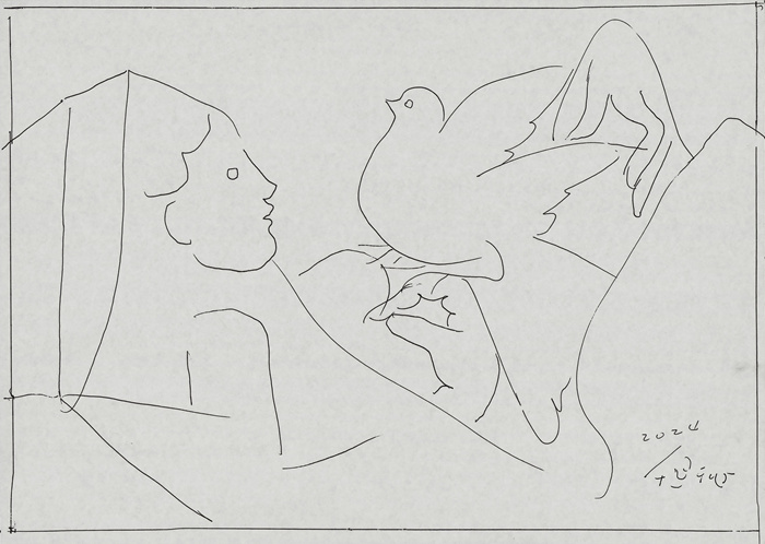這一次展覽的主題是和平與故鄉。劉巨德偏好兩個形象:鴿子與少女。他畫過無數的鴿子和少女,在他筆下,二者完全合二為一,成為純美至善的象征。劉巨德說過,藝術家不僅要提供美,還要提供慈與善,以慈觀世,以善作畫。鴿子與少女的形象,儼然成為了劉巨德的精神圖騰,他以這個圖騰的反復創造來宣揚和傳播老子“以慈為寶”的和平主義思想。他也畫馬,既畫草原的野馬,也畫北朝和唐代鞍韉華麗的舞馬。他厭惡戰爭但崇拜英雄,因為英雄能夠犧牲自己止戈為武捍衛和平。馬就是英雄的象征,是劉巨德的又一個精神圖騰。