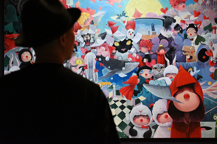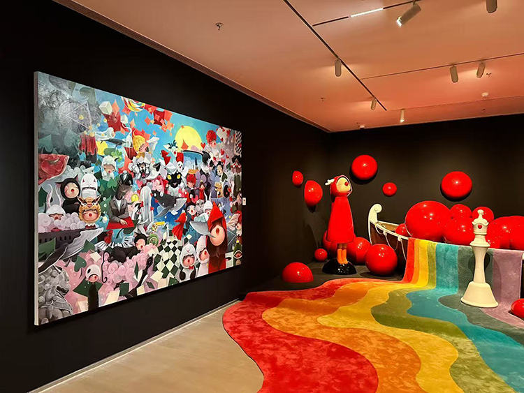 藝術家以經典形象Timmy&Tammy為引路人,將自己絢麗的精神世界剖開展示給了公眾。除了經典的紅鼻子小丑形象,惠唯將自己曾經職業魔術師的身份揉進溫暖治愈的藝術創作中,撲克牌與黑白棋盤元素在展陳中隨處可見,串連起藝術家惠唯從最初的魔法童話想象到如今自如表達治愈的創作心路。