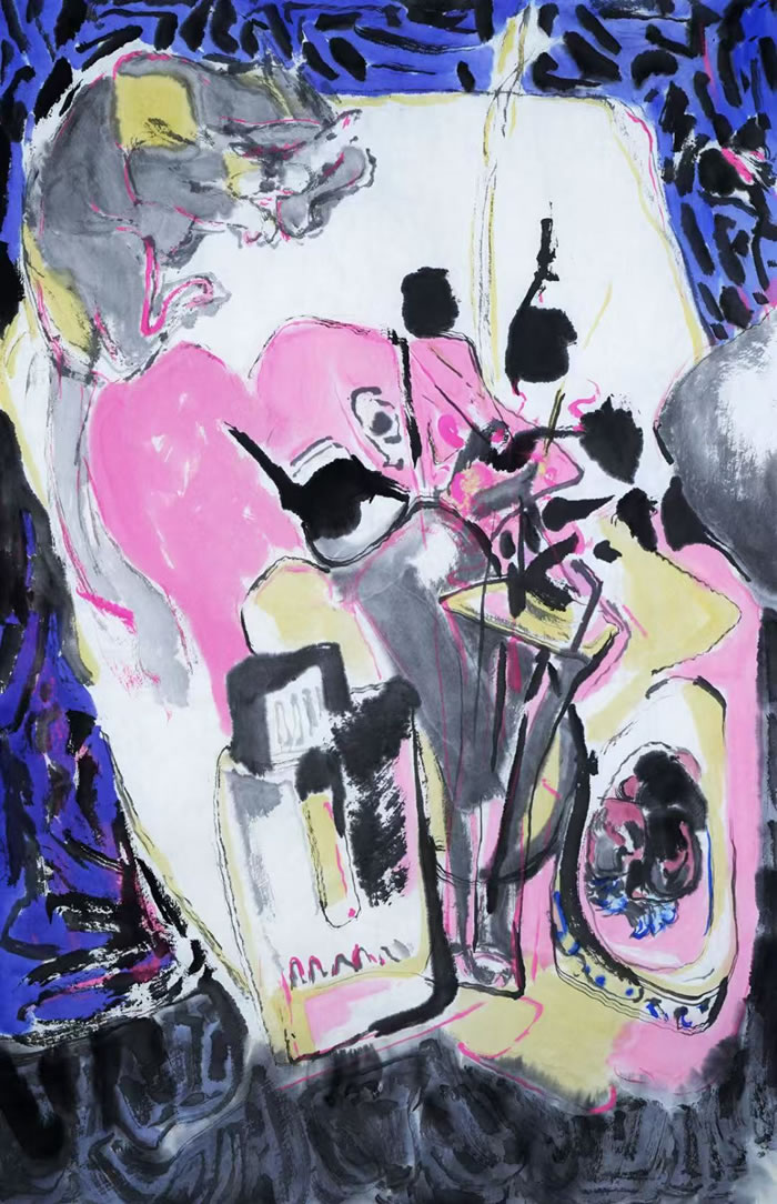 生長于白洋淀的藝術家自幼酷愛荷花,美好記憶的種子早就已經播下了。但不可能按照傳統方式去畫,在肯定現代性的欲望,甚至是紅色噴薄軀體的同時,還要使之融合到荷花的粉色花瓣與荷葉的青綠,還有荷梗的線條之中,甚至整個繪畫就是一滴滴荷葉上滑動的水珠,一起都是水,都是水線,都是水珠,都在絲絲牽纏之中,在欲斷又欲連之中,交織起來,滿福充滿,形成波波無盡的微妙振蕩。而之前的魔女形象則變得柔婉,宛若女菩薩或女神,經過水珠的洗滌而變得赤裸純潔,這是繪畫的洗滌,這是欲望的消融,這是《愛蓮說》的真意:“予獨愛蓮之出淤泥而不染,濯清漣而不妖?!比诵缘耐懽円呀洶l生。