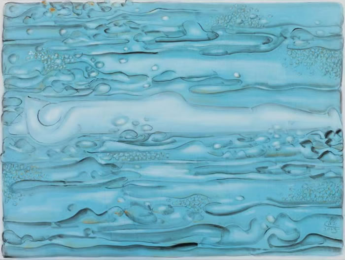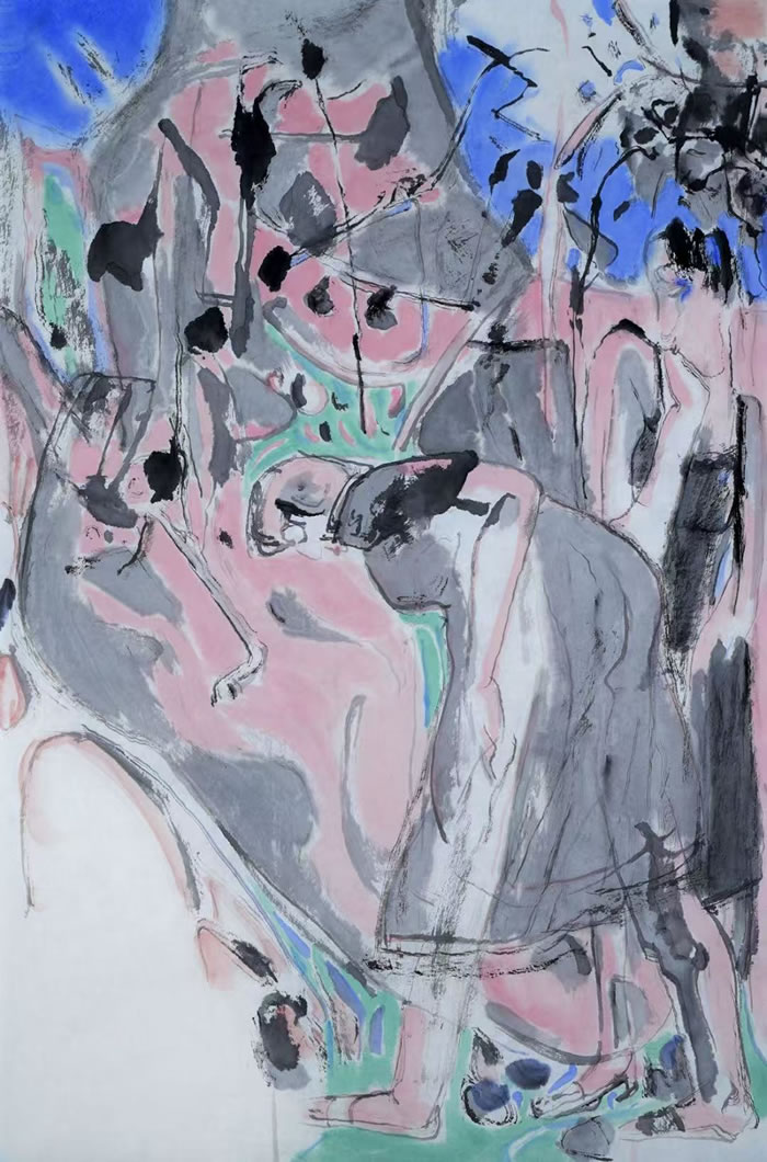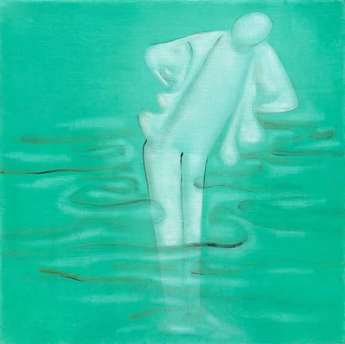 這些敞開懷抱擁抱世界的女性形體,既充滿了野蠻生長的感性活潑,又充分沉浸于蓮池的花瓣蕩漾,不就是“凌波微步”的當代表達?不就是水融天下的藝術真諦?蓮花已非蓮花,人性已非人性,經過藝術家很多年對于形體分解與融合的實驗,其帶入色彩的變形記有著一個中國藝術家獨特的萬物擬似的感通。而現在,在繪畫上,一切都融入水,人步入水中,沉浸期間,花如人,人如花,但花與人都如水,一滴滴水珠,進入微光之波的無盡振蕩。在畫家獨特色彩與質感處理后,在具有明顯中國色調與中國玉質感的技藝轉化后,都宛若珠玉,透明晶瑩,又彼此透映,宛若佛境。