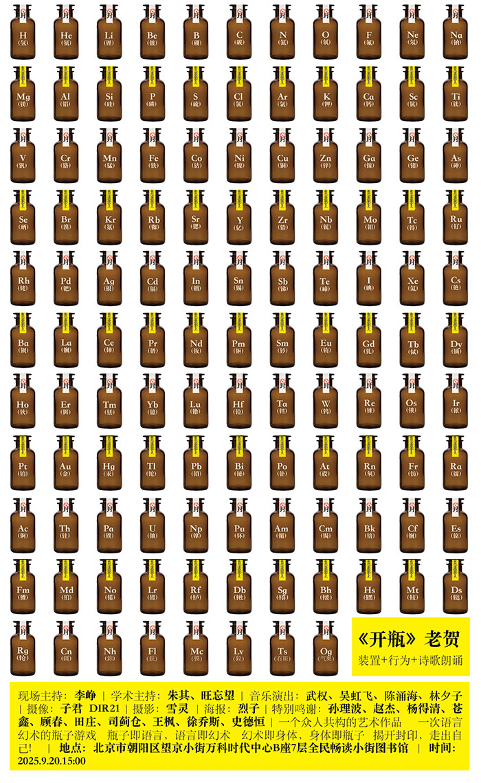 2025年9月25日下午,詩人老賀《開瓶》整體藝術展在望京萬科時代中心全民暢讀小街圖書館正式啟動?;顒游?50多位詩人、藝術家、音樂人、學者等齊聚會場。