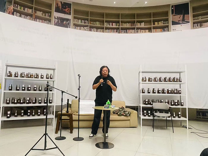 學術主持朱其說:老賀從自身特殊體驗上升到人生的普遍困境。佛教的感悟、藝術語言、觀念、裝置的形式都很到位。詩人老賀一出手就是高位,天花板,把幾種藝術形式連起來,很厲害。