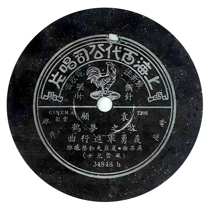 1935年上海百代唱片公司出品的《義勇軍進行曲》原版唱片,只有聶耳作曲的署名,由袁牧之、顧夢鶴等七名男演員演唱