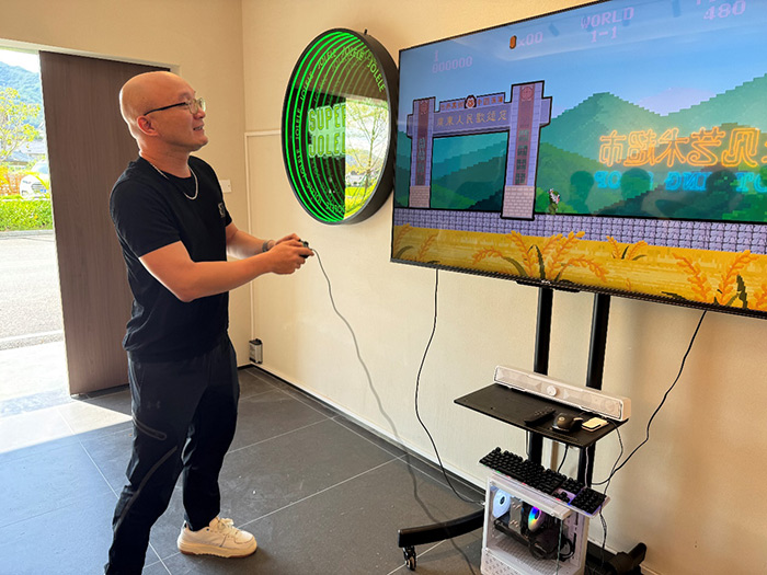 在米香中心的右前方有一座白色的三層小樓,這就是米香美術館,展廳一層有兩款以蕉嶺風物元素創作的有趣作品?!督稁X SuperJolele》是01小組(陳榮彬,梁鏈喜)開發的一款在地化游戲,它以80年代街機的復古形式與圍屋的磚紋、古樹的年輪、稻田的脈絡與蕉嶺風土深度融合,通過“跳躍-探索-積分”的互動邏輯,重構地方記憶的敘事方式。讓游客在游戲參與中,在趣味互動中體驗蕉嶺的歷史與地方知識。