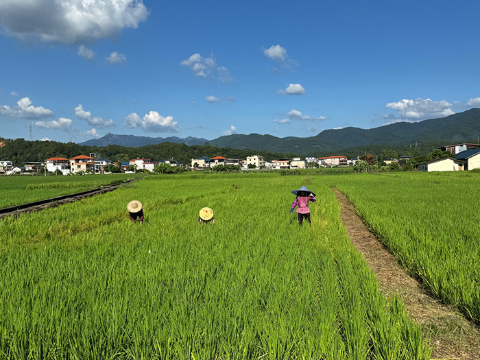 長潭鎮白馬村的米香中心,是眾多游客必到的打卡點。這是一座以客家民居建筑風格為底色的民宿,米香中心四周環境優美:前方是大片碧綠的稻田,青澀的稻穗隨風搖曳;遠方群山起伏,白墻灰瓦的客家民居點綴在蕉林間。行走在田間小徑上,空氣中彌漫著稻香,天地靜謐安然。稻田之間,藝術家許鐘敏、刁勇、袁澤強、楊千等藝術家的作品,將這片南國田園的詩意與浪漫呈現得淋漓盡致。