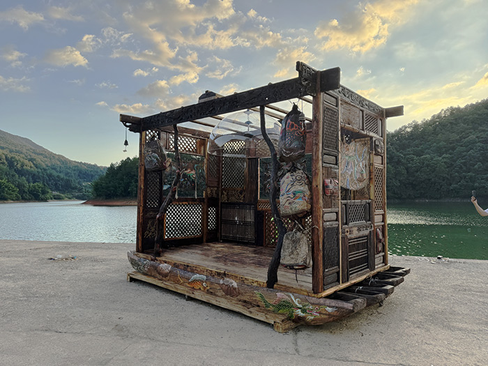 鄭澤生的《摩梭精靈》帶來云南的氣息。他以瀘沽湖八條豬槽船為基底,將雕花老木板、茶馬古道上的皮具、銅鈴等舊物拼貼成一座“船屋”。觀眾在其中可細細觀察窗欞上的雕花、麗江地區的動植物紋樣、牛皮皮具的肌理。這艘漂浮般的“船屋”,為觀者提供了一個異形的多元空間視角,也讓文化記憶在流動與拼貼中尋回扎實的根脈。
