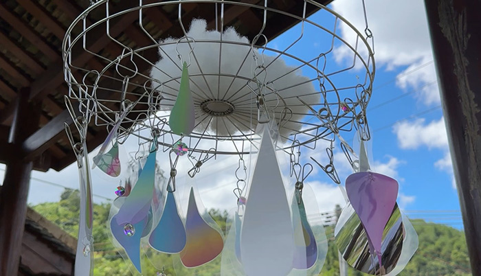 藝術家詹海蕙感受到蕉嶺自然風物的魅力,在高思村泉水橋這座古橋上搭建了一座云朵與水滴的劇場——《懸置的儀式:幸福的微觀宇宙》,她以“衣架”懸置封裝石窟河水的彩色水滴、折射光線的棱鏡、微縮大自然的鑲嵌玻璃、飄逸的云絮。作品似乎邀請過橋者暫停腳步,透過一滴水看見倒映的橋影,觸碰光影引發波動,在凝視中體驗“此刻”的充盈。