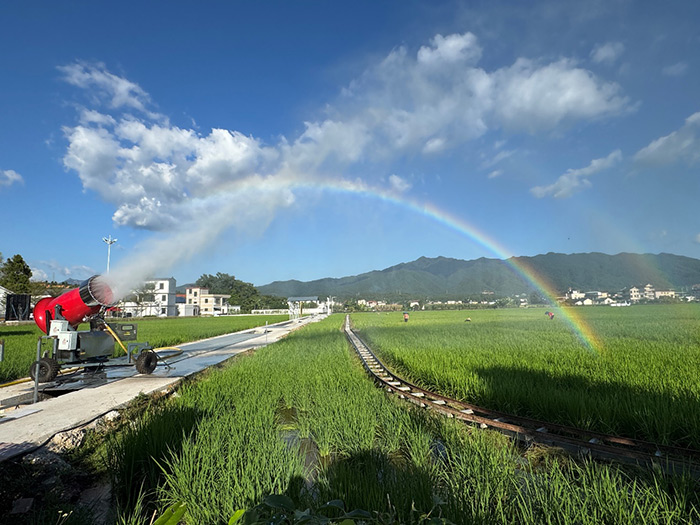 另一件極致“浪漫化”的作品是楊千的《虹》,藝術家通過與技術工廠的深度合作,將工業設備(造雪機)改造為一座精密的“彩虹發生器”。當紅色的圓筒噴薄出大量水霧時,陽光照射在水幕之上,就形成了一座跨越在稻田上方的彩虹,作品展示出冰冷的工業技術同樣可以在藝術家的巧思和想象中轉化為自然的奇觀與詩意。